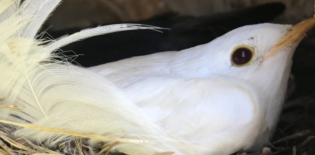 NestWatcher Finds Rare Albino NestlingA NestWatcher discovers an albino Tree Swallow in a Massachusetts nest box. Fewer than one-half of a percent of all birds have this genetic condition.